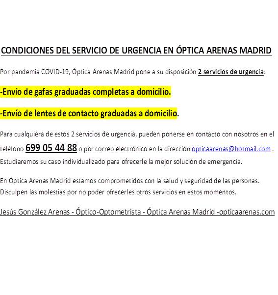 27 03, 2020 CONDICIONES DEL SERVICIO DE URGENCIA EN ÓPTICA ARENAS MADRID POR COVID-19 Galería CONDICIONES DEL SERVICIO DE URGENCIA EN ÓPTICA ARENAS MADRID POR COVID-19 Sin categorizar CONDICIONES DEL SERVICIO DE URGENCIA EN ÓPTICA ARENAS MADRID POR COVID-19 Jesús González Arenas2020-03-27T08:48:41+00:00marzo 27th, 2020|Sin comentarios Más información