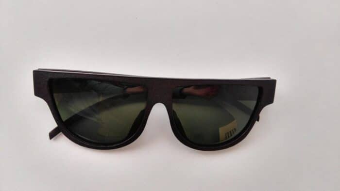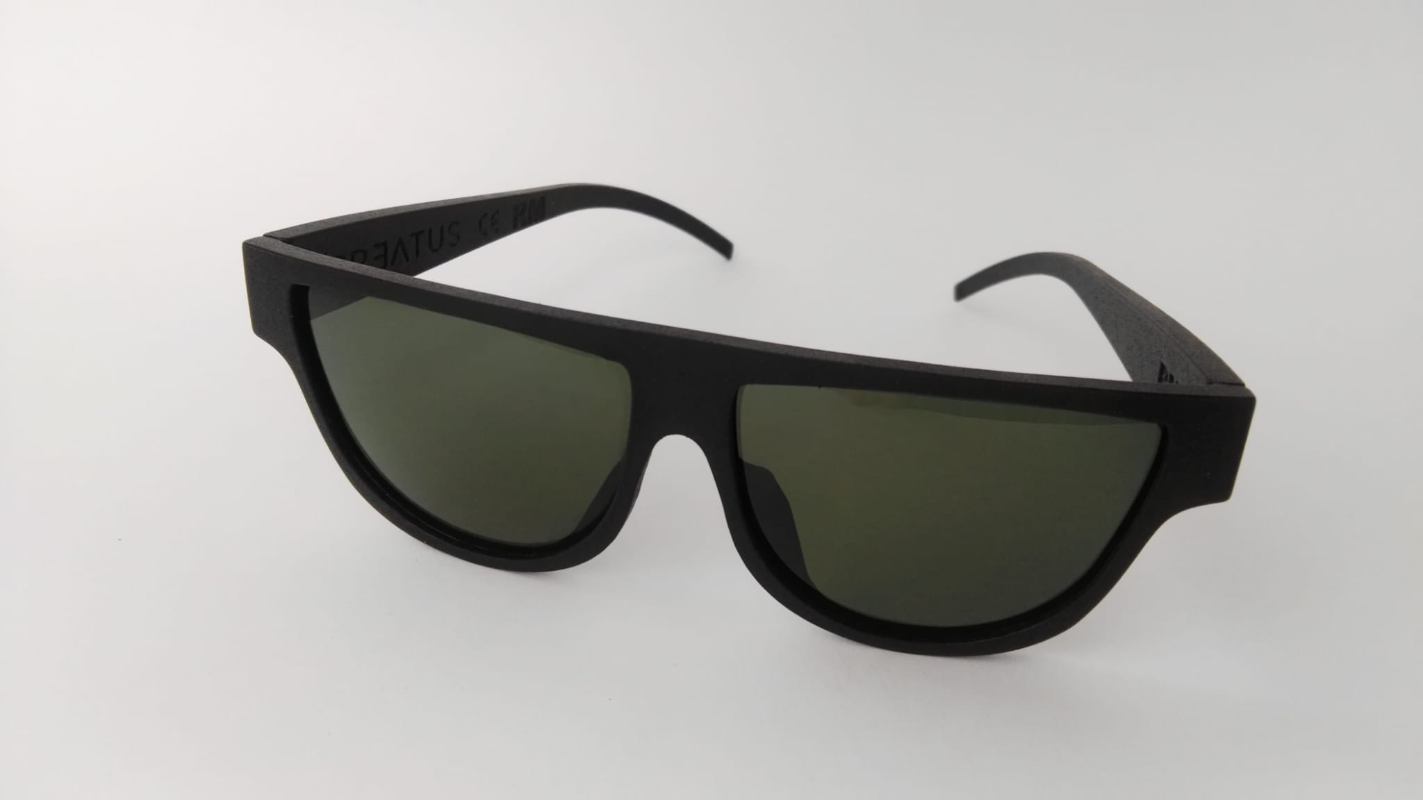 Gafas de sol realizadas en polvo de poliamida compactada por sinterizado láser selectivo. Más ligero que el titanio y más resistente que el acetato de celulosa. Cristales de sol Zeiss polarizados en tono G-15 (gris-verde). Calibre: 54 mm. Puente: 14 mm. Varilla: 138 mm.