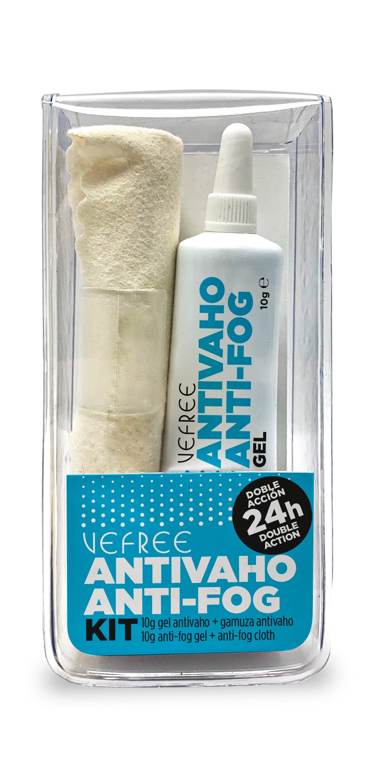 Kit de doble acción gel y gamuza anti-vaho. La acción conjunta consigue un potente y duradero efecto anti-vaho, limpiando al mismo tiempo las lentes en cada aplicación.